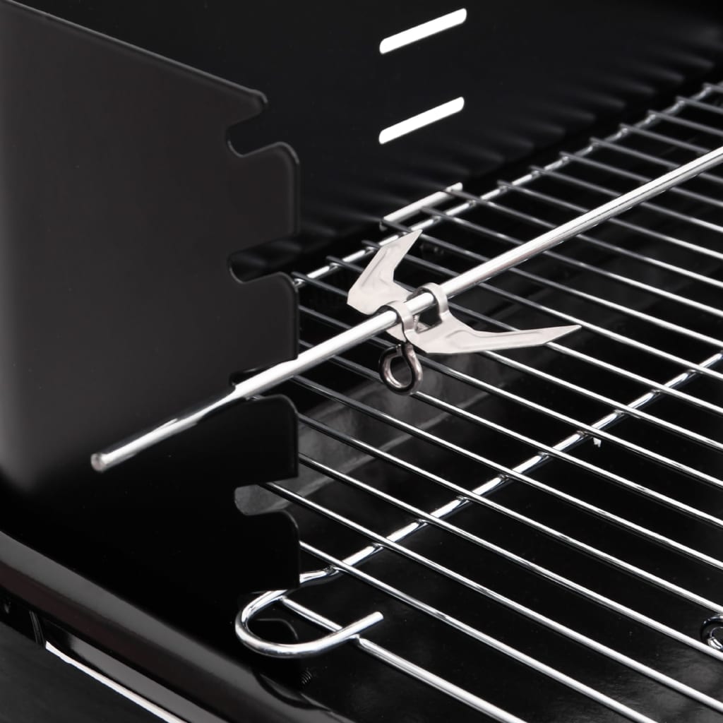 Appréciez les rôtis et les grillades avec ce barbecue au charbon de bois ! Construction robuste : le gril à charbon de bois est fabriqué en acier et a une construction solide et durable. L’acier est un matériau exceptionnellement dur et solide. Il offre robustesse et stabilité.Hauteur réglable : la hauteur du support du barbecue peut être facilement réglée de 71 à 85 cm pour utiliser au mieux la chaleur du charbon de bois.Pare-vent pratique : la grille de barbecue au charbon de bois est équipée d’un pare-vent qui empêche les vents violents de nuire aux grillades et ses orifices d’aération assurent une bonne circulation de l’air pour une expérience de barbecue agréable.Avec étagères : une étagère latérale et une étagère inférieure permettent de ranger facilement les accessoires du barbecue.Accessoires pour barbecue : avec la grille de cuisson chromée et la rôtissoire, votre barbecue sera facile et amusant !Déplacement facile : le fumoir à charbon a deux roues et une poignée latérale en bois robuste, ce qui le rend facile à déplacer partout où vous en avez besoin. Attention :Le gril de barbecue deviendra très chaud pendant l’utilisation. NE PAS le déplacer pendant le fonctionnement.