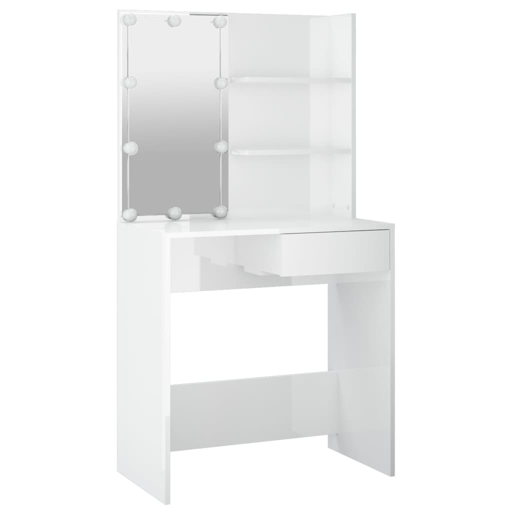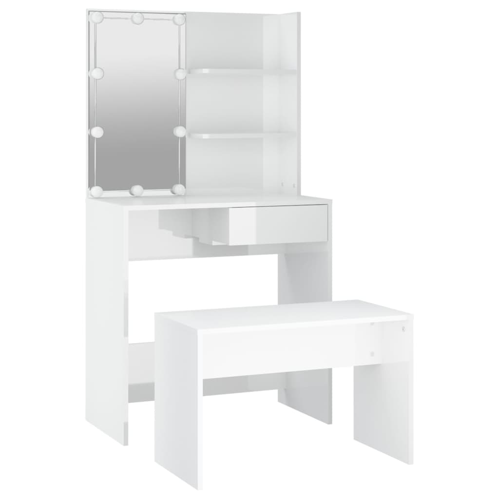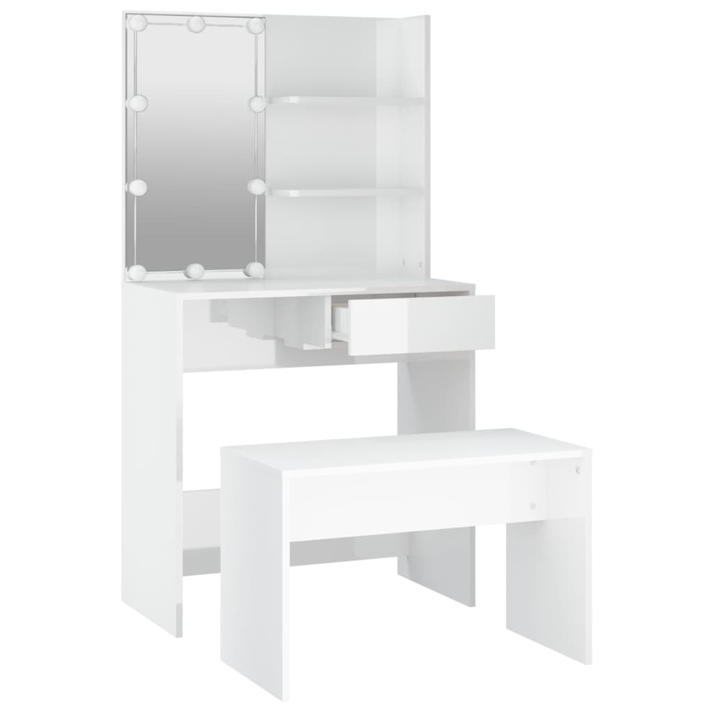 L’ensemble de coiffeuse tendance donne à votre chambre à coucher un look intemporel et raffiné. L’ensemble de coiffeuse avec LED est un supplément parfait au décor de votre chambre à coucher et garde vos cosmétiques à portée de main ! Matériau stable : le bois d’ingénierie est d’une qualité exceptionnelle avec une surface lisse et présente également résistance, stabilité et résistance à l’humidité.Miroir utilitaire : la coiffeuse avec miroir est parfaite pour votre routine beauté quotidienne. Le miroir vous permet de prendre soin de la peau de votre visage et de vous maquiller aussi !Grand espace de rangement : la coiffeuse avec tabouret offre suffisamment d’espace pour un accès facile à votre maquillage, vos bijoux et vos essentiels du quotidien.Lumière LED : la coiffeuse dispose également d’ampoules LED avec USB, qui sont faciles à changer de mode du blanc chaud au blanc froid. Les ampoules LED autour du miroir illuminent également votre beauté.Applications larges : cet ensemble de table de coiffeuse convient à divers endroits, telles que votre chambre à coucher, vestiaire et toute autre pièce dans laquelle vous souhaitez le placer. Avertissement :Afin d’éviter qu’il ne bascule, ce produit doit être utilisé avec le dispositif de fixation murale fourni. Remarque :Chaque produit est livré avec un manuel de montage dans la boîte pour un montage facile.