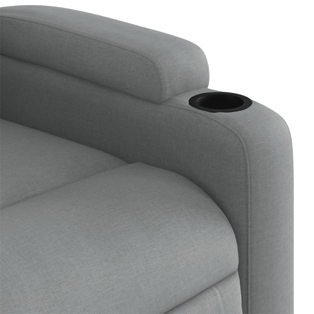 Asseyez-vous et détendez-vous dans ce fauteuil inclinable de massage très confortable ! Fonction d’inclinaison manuelle : ce fauteuil inclinable est doté d’une poignée du côté droit. Vous pouvez régler manuellement le repose-pieds et le dossier dans n’importe quelle position selon votre confort en tirant simplement sur la poignée. Cette fonction permet une inclinaison maximale de 135 degrés. De plus, le dossier peut revenir rapidement à sa position d’origine en tirant simplement sur la poignée.Fonction de vibration : les 6 points de massage vous permettent de faire l’expérience d’un massage mieux ciblé. De plus, la télécommande incluse vous permet de choisir différents programmes de massage. La fonction de massage est alimentée par le connecteur USB, mais la source d’alimentation USB 5V certifiée n’est pas incluse.Expérience d’assise confortable : le siège, le dossier et les larges accoudoirs bien rembourrés recouverts de tissu procurent une sensation confortable et chaleureuse, vous permettant de vous sentir enveloppé lorsque vous êtes assis. Le tissu présente un aspect simple et épuré et est respirant et durable.Porte-gobelets et poche latérale pratiques : ce fauteuil dispose de deux porte-gobelets pratiques pour vos boissons et d’une poche latérale pour votre télécommande ou pour garder vos objets essentiels à portée de main.Cadre solide et stable : le cadre en bois et en métal offre une structure solide et une grande stabilité. Ce fauteuil inclinable est confortable et durable.