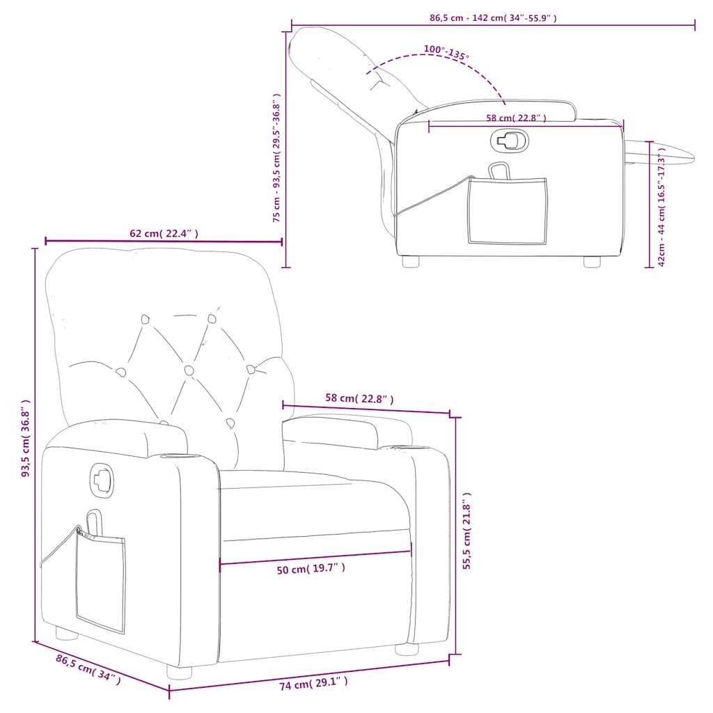 Asseyez-vous et détendez-vous dans ce fauteuil inclinable de massage très confortable ! Fonction d’inclinaison manuelle : ce fauteuil inclinable est doté d’une poignée du côté droit. Vous pouvez régler manuellement le repose-pieds et le dossier dans n’importe quelle position selon votre confort en tirant simplement sur la poignée. Cette fonction permet une inclinaison maximale de 135 degrés. De plus, le dossier peut revenir rapidement à sa position d’origine en tirant simplement sur la poignée.Fonction de vibration : les 6 points de massage vous permettent de faire l’expérience d’un massage mieux ciblé. De plus, la télécommande incluse vous permet de choisir différents programmes de massage. La fonction de massage est alimentée par le connecteur USB, mais la source d’alimentation USB 5V certifiée n’est pas incluse.Expérience de siège confortable : le siège, le dossier et les larges accoudoirs rembourrés épais recouverts de similicuir procurent une sensation confortable, vous faisant vous sentir enlacé lorsque vous êtes assis. Le similicuir est un matériau très résistant. Il est résistant aux taches, ce qui le rend facile à nettoyer avec un chiffon humide. La surface lisse donne également un aspect luxueux et la beauté du cuir véritable.Porte-gobelets et poche latérale pratiques : ce fauteuil dispose de deux porte-gobelets pratiques pour vos boissons et d’une poche latérale pour votre télécommande ou pour garder vos objets essentiels à portée de main.Cadre solide et stable : le cadre en bois et en métal offre une structure solide et une grande stabilité. Ce fauteuil inclinable est confortable et durable.