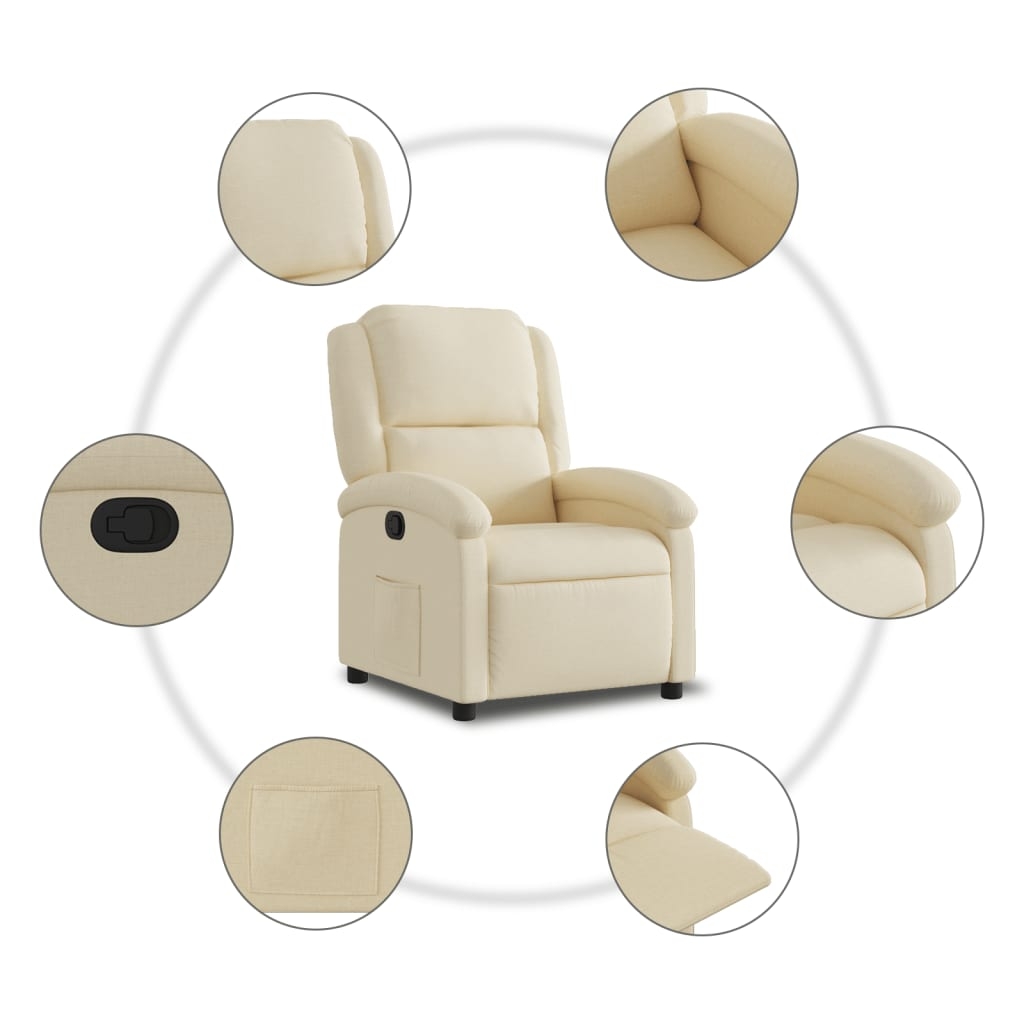 Asseyez-vous et détendez-vous dans ce fauteuil inclinable très confortable ! Fonction d’inclinaison manuelle : ce fauteuil inclinable est doté d’un bouton du côté droit. Vous pouvez régler manuellement le repose-pieds et le dossier dans n’importe quelle position selon votre confort en tirant simplement sur la poignée. Cette fonction permet une inclinaison maximale de 135 degrés. De plus, le dossier peut revenir rapidement à sa position d’origine en tirant simplement sur la poignée.Expérience d’assise confortable : le siège, le dossier et les larges accoudoirs bien rembourrés recouverts de tissu procurent une sensation confortable et chaleureuse, vous permettant de vous sentir enveloppé lorsque vous êtes assis. Le tissu présente un aspect simple et épuré et est respirant et durable.Poche latérale pratique : ce fauteuil est doté d’une poche latérale pour vous permettre de garder vos objets essentiels à portée de main.Cadre solide et stable : le cadre en bois et en métal offre une structure solide et une grande stabilité. Ce fauteuil inclinable est confortable et durable.