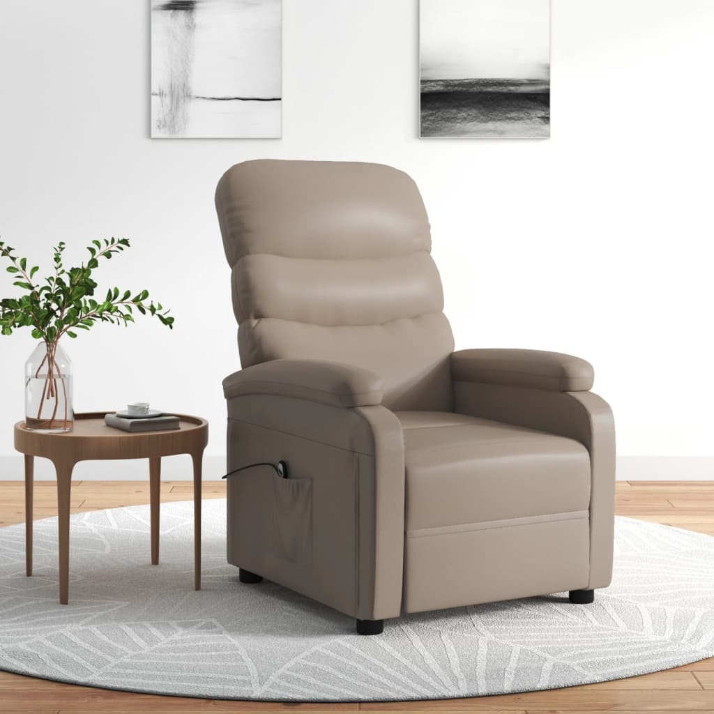 Asseyez-vous et détendez-vous dans ce fauteuil inclinable électrique très confortable ! Fonction d’inclinaison électrique : le fauteuil inclinable est équipé d’un moteur électrique pour la fonction d’inclinaison. Il offre 3 positions d’inclinaison et vous pouvez facilement régler le dossier et le repose-pied à l’aide de la commande manuelle à 2 boutons incluse, en fonction de votre confort.Expérience de siège confortable : le siège, le dossier et les larges accoudoirs rembourrés épais recouverts de similicuir procurent une sensation confortable et chaleureuse, vous faisant vous sentir enlacé lorsque vous êtes assis. Le simili cuir est un matériau très résistant. Il est résistant aux taches, ce qui le rend facile à nettoyer avec un chiffon humide. La surface lisse donne également un aspect luxueux et la beauté du cuir véritable.Cadre solide et stable : le cadre en bois et en métal offre une structure solide et une grande stabilité. Ce fauteuil inclinable est confortable et durable.