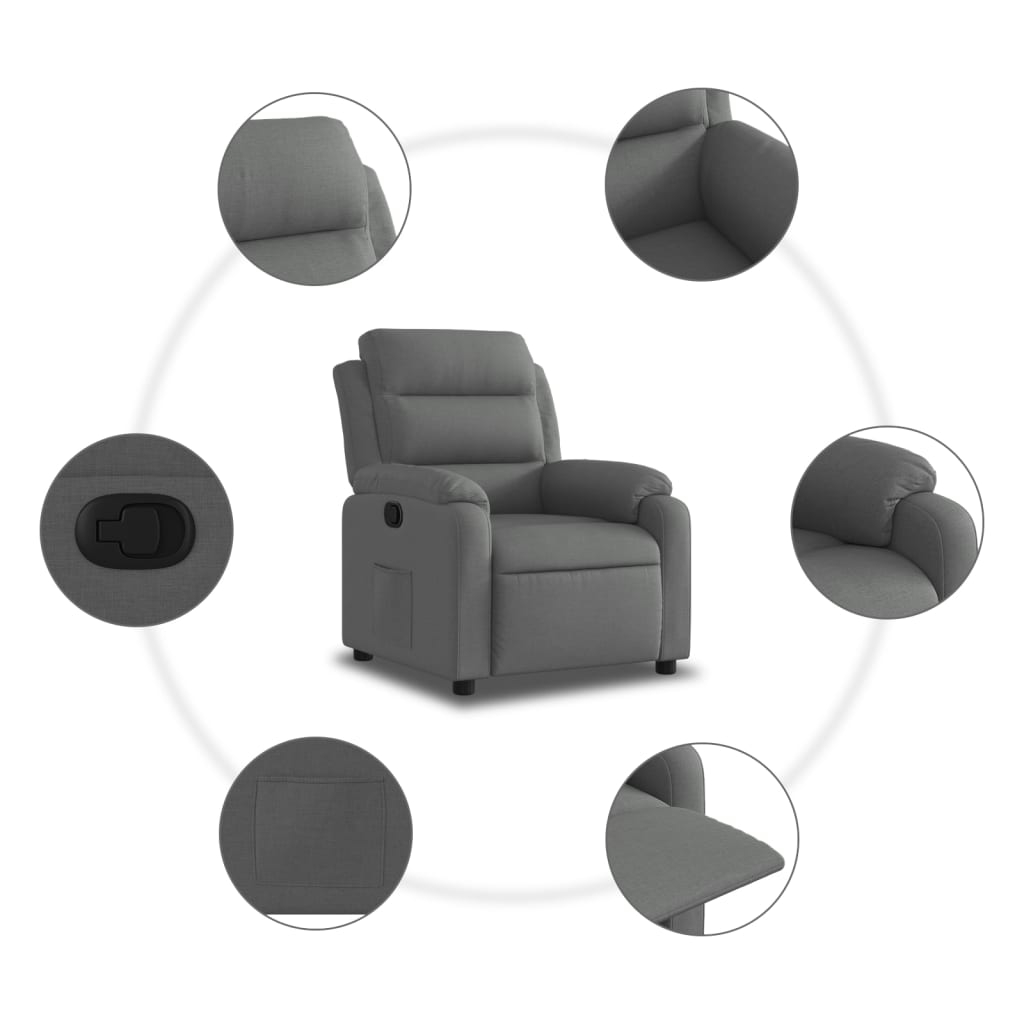 Asseyez-vous et laissez-vous emporter par ce fauteuil inclinable ultra-confortable ! Fonction d’inclinaison manuelle : Ce fauteuil inclinable est doté d’une poignée sur le côté droit. Vous pouvez régler manuellement le repose-pieds et le dossier à votre convenance d’une simple traction sur la poignée. Cette fonction permet une inclinaison maximale de 135 degrés. De plus, le dossier peut revenir rapidement à sa position initiale d’une simple traction sur la poignée.Assise confortable : L’assise, le dossier et les larges accoudoirs rembourrés et recouverts de tissu offrent une sensation de confort et de chaleur, vous permettant de vous sentir bien installé. Le tissu, au look simple et épuré, est respirant et durable.Poche latérale pratique : Ce fauteuil est doté d’une poche latérale pour garder vos objets essentiels à portée de main.Cadre solide et stable : Le cadre en bois et en métal offre une structure solide et stable. Ce fauteuil inclinable est confortable et durable.