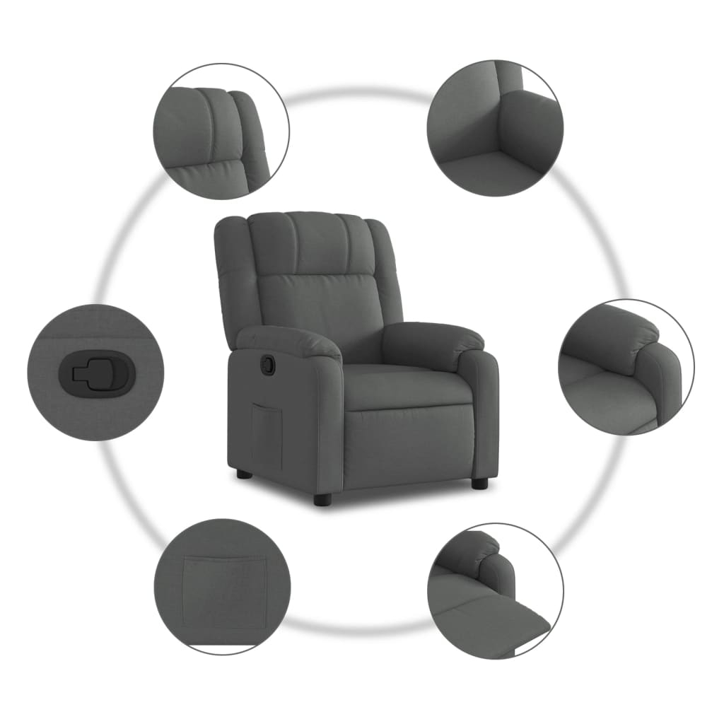 Asseyez-vous et détendez-vous dans ce fauteuil inclinable très confortable ! Fonction d’inclinaison manuelle : ce fauteuil inclinable est doté d’une poignée du côté droit. Vous pouvez régler manuellement le repose-pieds et le dossier dans n’importe quelle position selon votre confort en tirant simplement sur la poignée. Cette fonction permet une inclinaison maximale de 135 degrés. De plus, le dossier peut revenir rapidement à sa position d’origine en tirant simplement sur la poignée.Expérience d’assise confortable : le siège, le dossier et les larges accoudoirs bien rembourrés recouverts de tissu procurent une sensation confortable et chaleureuse, vous permettant de vous sentir enveloppé lorsque vous êtes assis. Le tissu présente un aspect simple et épuré et est respirant et durable.Poche latérale pratique : ce fauteuil est doté d’une poche latérale pour vous permettre de garder vos objets essentiels à portée de main.Cadre solide et stable : le cadre en bois et en métal offre une structure solide et une grande stabilité. Ce fauteuil inclinable est confortable et durable.
