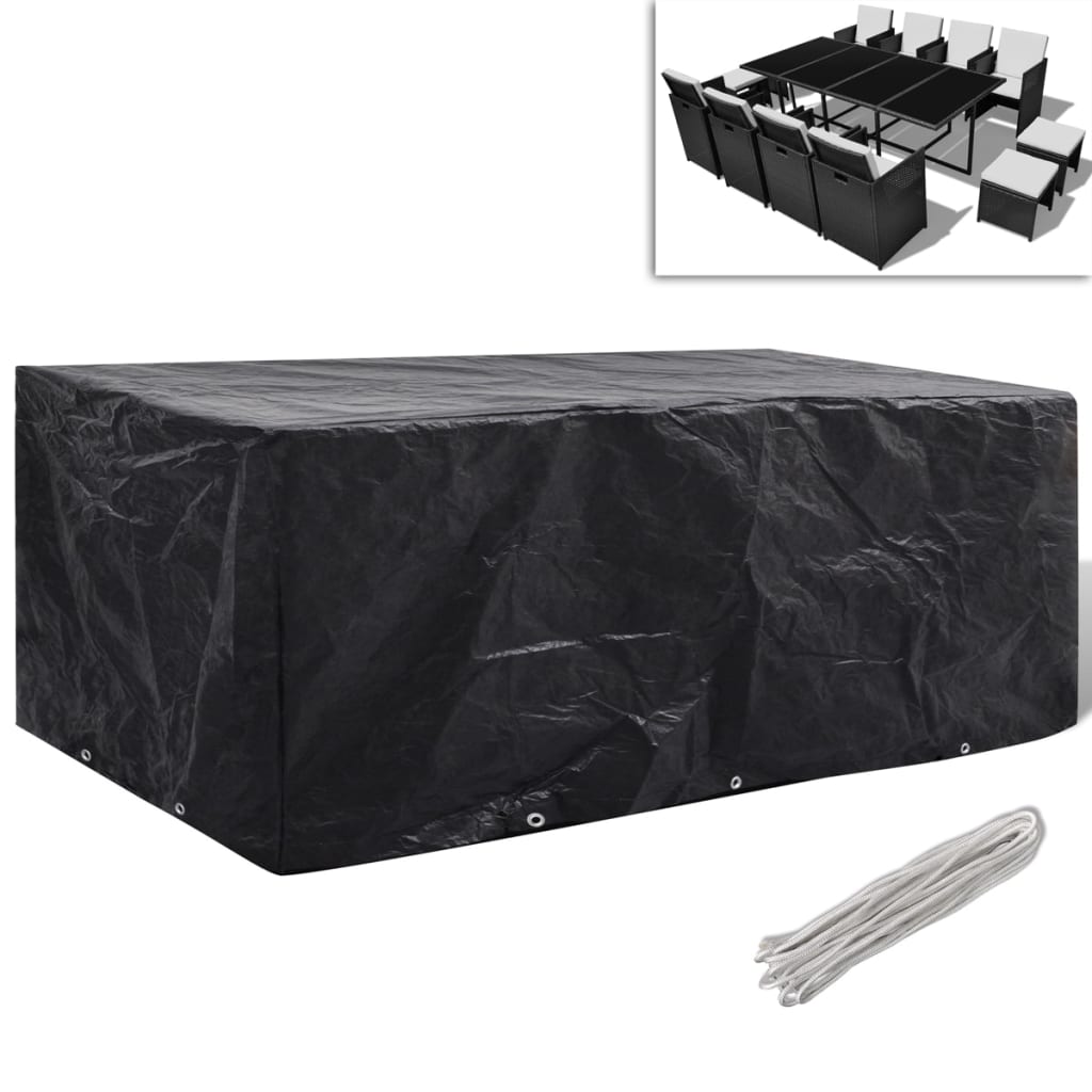 Cette housse de mobilier de jardin de haute qualité est adaptée à la protection toute l’année de vos ensembles de mobilier en rotin de la saleté, du vent, de la pluie et de la lumière UV. La housse est faite de polyéthylène durable, qui est résistante à l’eau, aux UV et à la déchirure et donc adaptée à un usage quotidien. Elle a 10 œillets en aluminium et une corde de fixation, donc elle s’adaptera mieux à votre meuble. La housse est adaptée à notre ensemble en rotin de 8 personnes avec SKU 40924 / 40837. Vous pouvez également utiliser cette housse pour d’autres ensembles de meubles, tant que cela est compatible avec la taille de vos meubles. Remarque : ce produit n’est pas 100 % étanche. Ainsi, nous vous recommandons de le traiter avec un spray imperméabilisant pour une meilleure fonction d’imperméabilité.