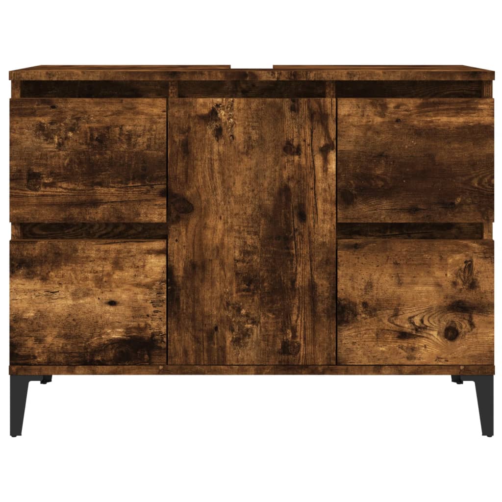 Cette armoire de lavabo est censée être un excellent supplément à votre salle de bain, ce qui lui donne une apparence ordonnée et saisissante ! Matériau durable : le bois d’ingénierie est d’une qualité exceptionnelle avec une surface lisse et présente également résistance, stabilité et résistance à l’humidité.Grand espace de rangement : le meuble d’évier de salle de bain dispose de 4 tiroirs et d’1 compartiment avec une porte, offrant diverses options de rangement et un espace supplémentaire pour ranger des articles dans votre salle de bain. Le dessus du meuble de salle de bain est idéal pour placer l’évier.Pieds en métal : les pieds en métal ajoutent un style moderne et calme à votre intérieur tout en assurant la stabilité.Surface facile à nettoyer : le meuble de salle de bain est facile à nettoyer avec un chiffon humide. Attention :Pour éviter qu’il ne soit renversé, ce produit doit être utilisé avec le dispositif de fixation au mur fourni. Bon à savoir :Pour faciliter au maximum le montage, chaque produit est livré avec des instructions.L’évier n’est pas inclus.