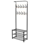 Ce porte-manteau pratique vous permettra d’organiser vos affaires et de les rendre facilement accessibles ! Cadre stable et robuste : le fer est un matériau solide et dur. C’est un solide favori dans la construction industrielle et la fabrication de meubles. Le bois de hêtre a un grain droit et est très durable. Fabriqué en fer et en bois de hêtre, ce porte-manteau est robuste et durable.Espace de rangement suffisant : le cintre comprend 6 patères de rangement pour offrir beaucoup d’espace pour accrocher des articles, notamment des vêtements, des sacs, des chapeaux, etc. Avec les patères à différents niveaux, le support aide à ranger vos affaires de manière ordonnée.Base robuste : la base est faite d’un revêtement en plastique avec du ciment à l’intérieur, elle est donc suffisamment lourde pour que le porte-manteau reste stable.Nombreuses applications : ce porte-manteau sur pied pratique est parfait pour être placé dans le couloir, le salon, la chambre à coucher ou tout autre endroit où vous avez besoin d’être mieux organisé pour garder votre maison propre et bien rangée !