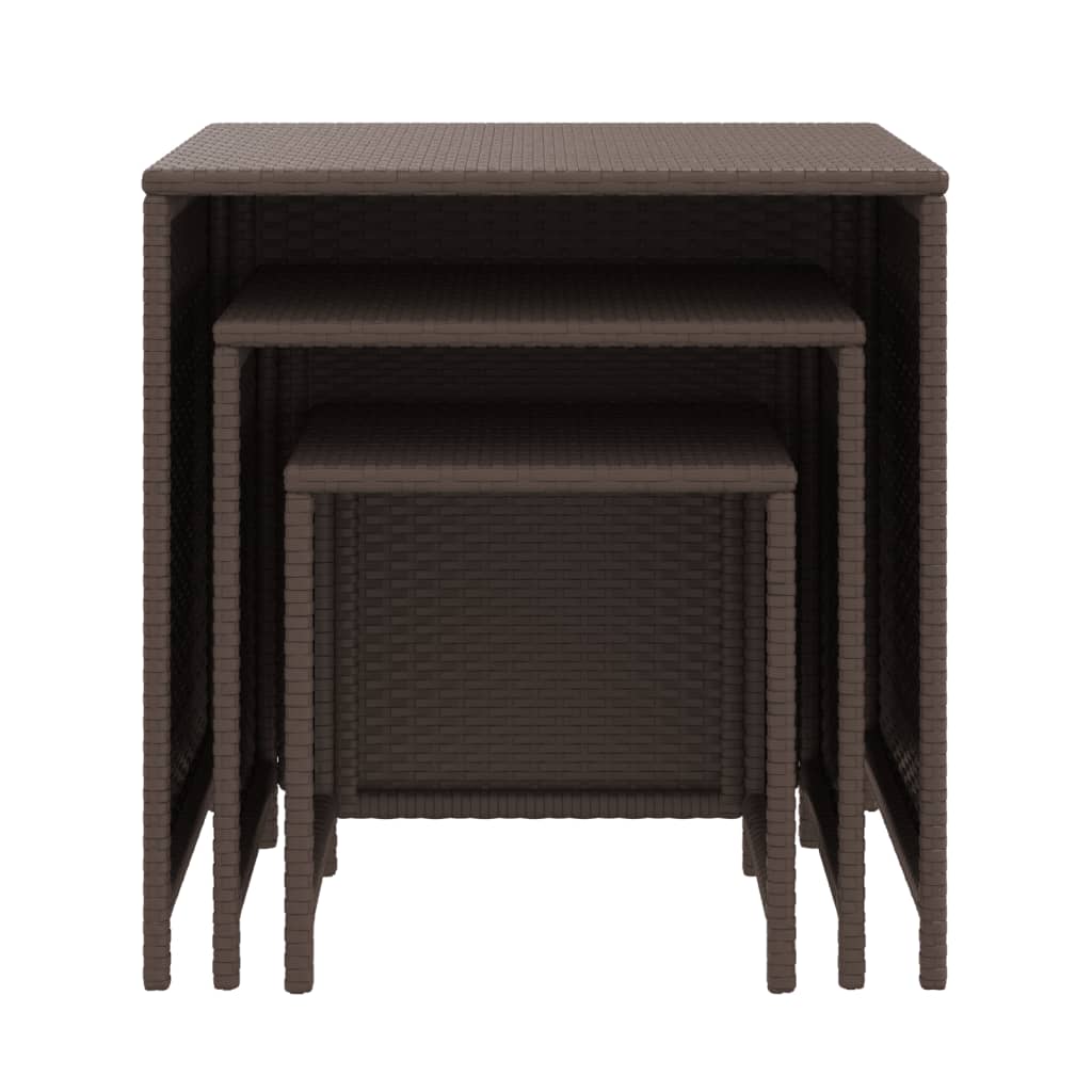 Ces tables gigognes de différentes tailles sont simples mais fonctionnelles, ce qui en fait un point central dans n’importe quel espace. Matériau durable : la résine tressée, également connue sous le nom de rotin poly, résiste aux intempéries et est facile à nettoyer. Elle reste belle à l’extérieur pendant une longue période. Elle est plus économique que d’autres matériaux, tout en offrant une excellente qualité, une commodité et un aspect esthétique.Cadre robuste : les cadres en acier enduit de poudre de ces tables basses gigognes offrent robustesse et stabilité.Design d’imbrication : grâce à la différence de taille, ces tables d’appoint gigognes peuvent non seulement répondre à vos multiples besoins, mais offrent également un espace supplémentaire et un rangement facile lorsque les plus petites tables sont cachées sous la plus grande.Dessus de table stable : le dessus de table robuste de l’ensemble de tables gigognes est idéal pour reposer vos boissons ou tout autre nécessaire dont vous avez besoin à portée de main. Bon à savoir :Pour faciliter au maximum le montage, chaque produit est livré avec des instructions. Remarque :Pour que vos meubles d’extérieur restent beaux, nous vous recommandons de les protéger avec une housse imperméable.
